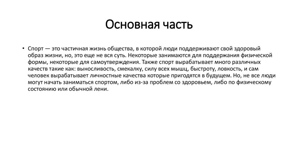 Основная часть• Спорт — это частичная жизнь общества, в которой люди поддерживают свой здоровый