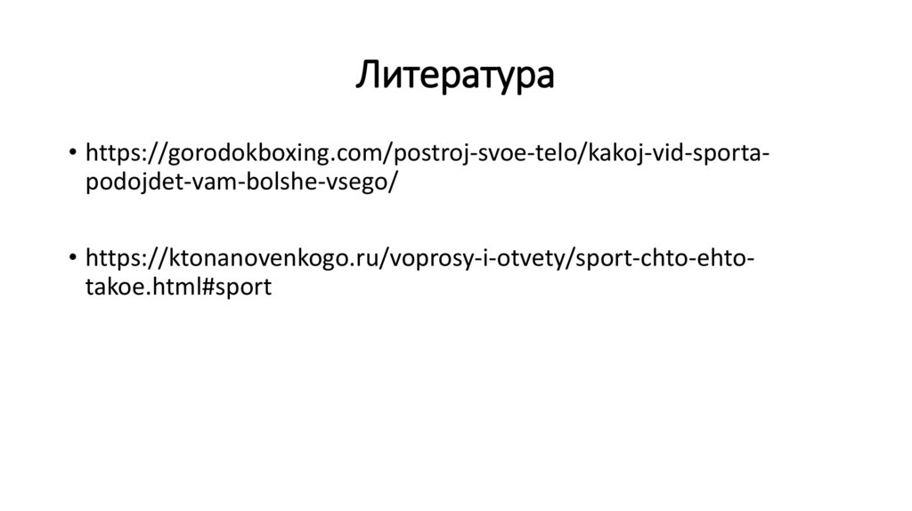 Литература• https://gorodokboxing.com/postroj-svoe-telo/kakoj-vid-sportapodojdet-vam-bolshe-vsego/