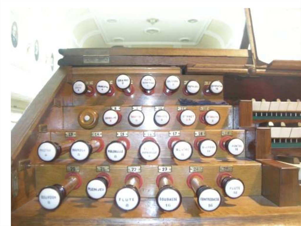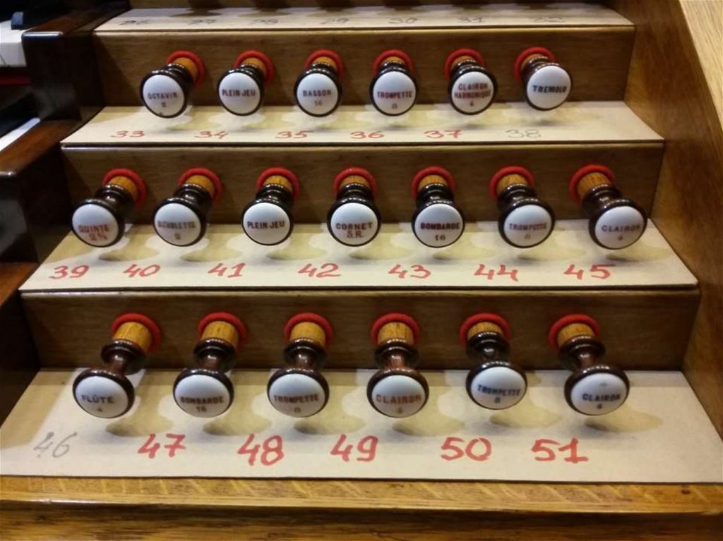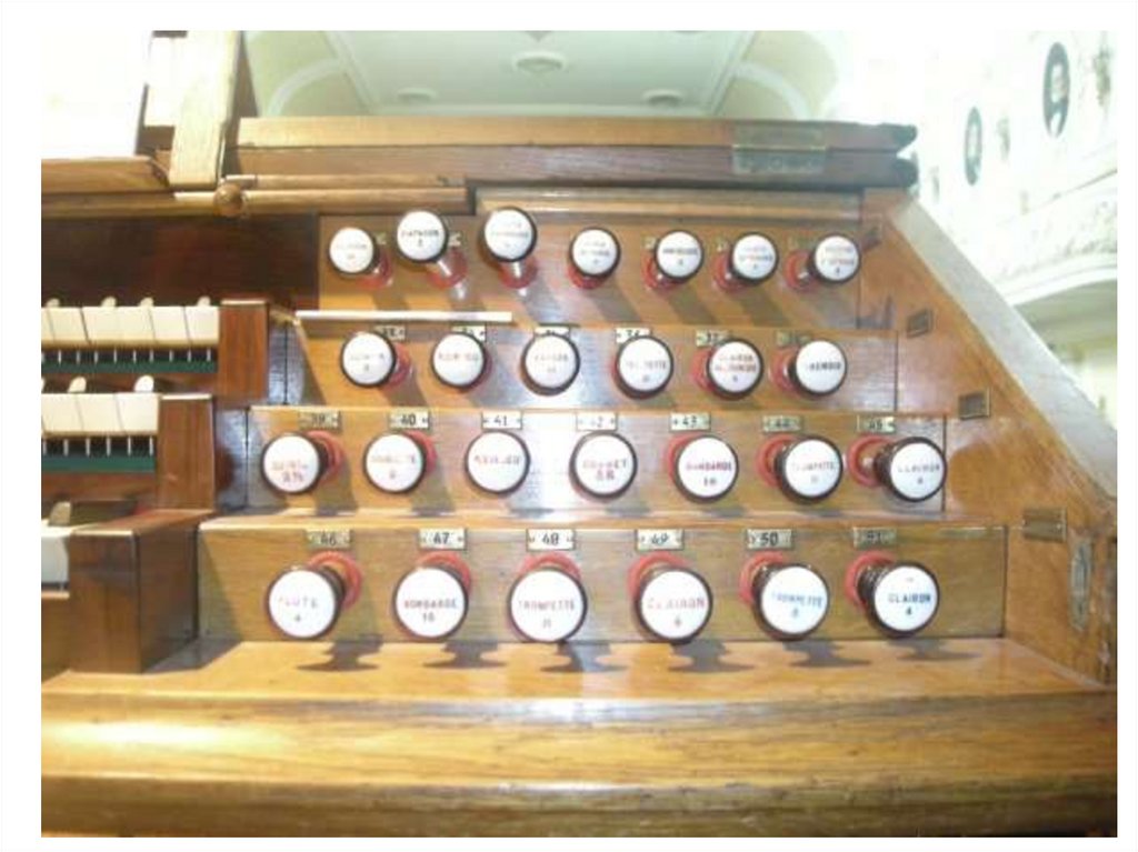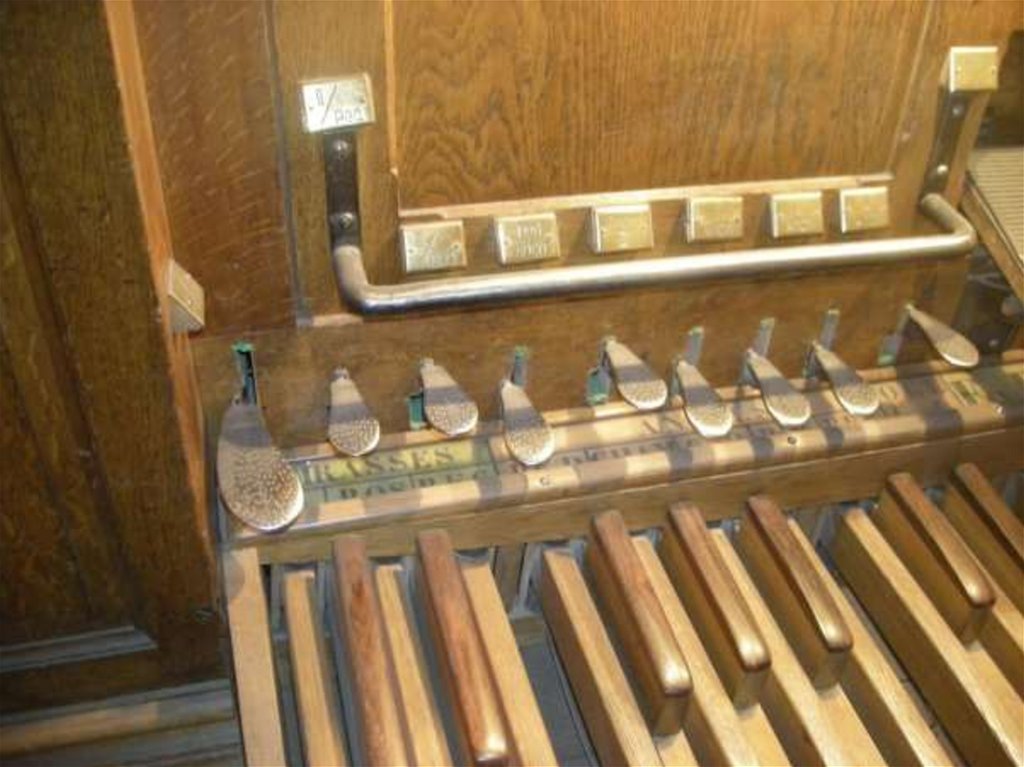 C.O/Ped, Pos/Ped, Rec/Ped, Anches Ped, Cham, G.O, Pos, Rec, octaves graves G.O, Pos, Rec,. Barker G.O,