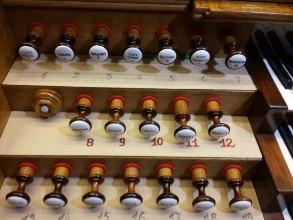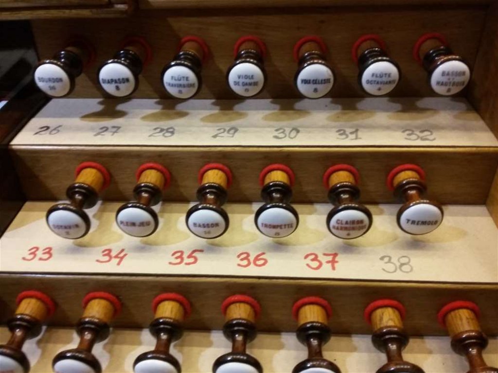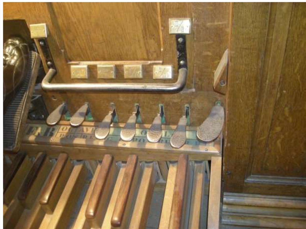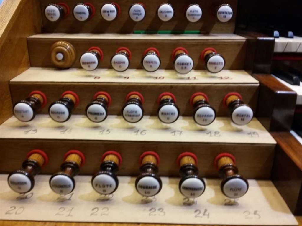 C.O/Ped, Pos/Ped, Rec/Ped, Anches Ped, Cham, G.O, Pos, Rec, octaves graves G.O, Pos, Rec,. Barker G.O,