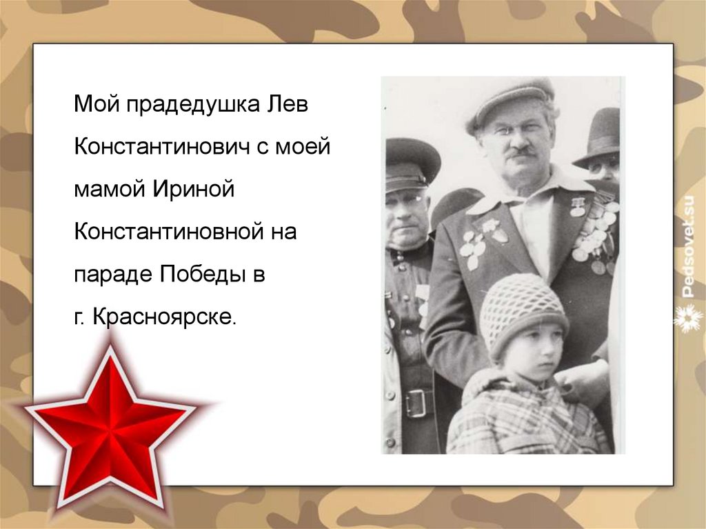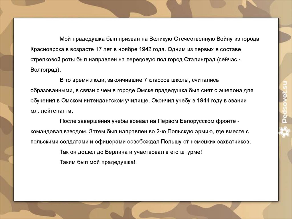 Мой прадедушка был призван на Великую Отечественную Войну из городаКрасноярска в возрасте 17 лет в ноябре 1942 года. Одним из первых в составе