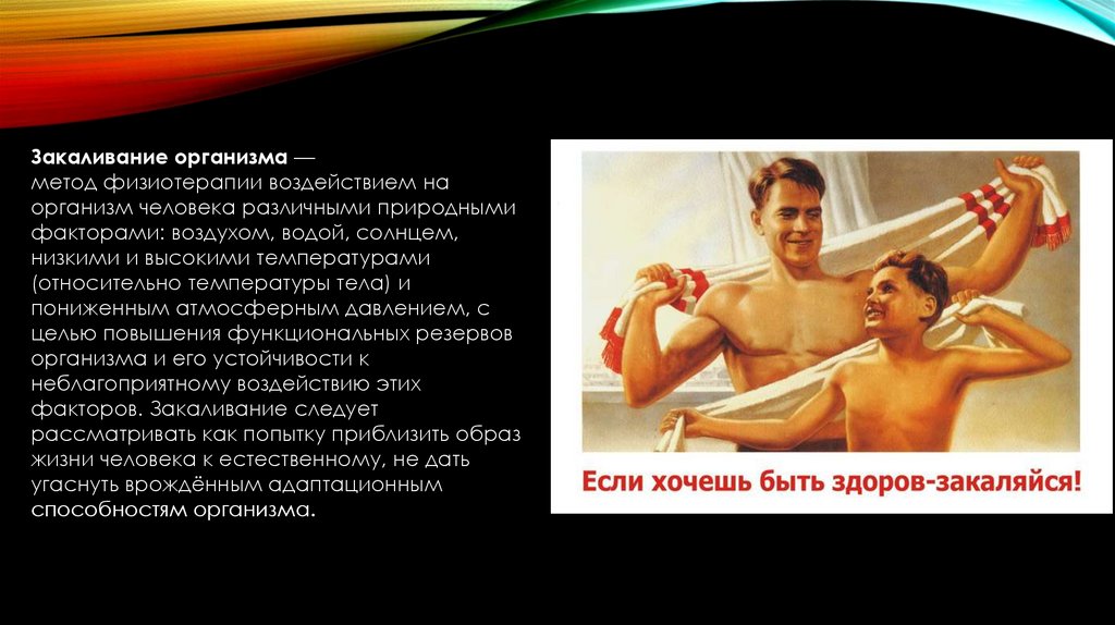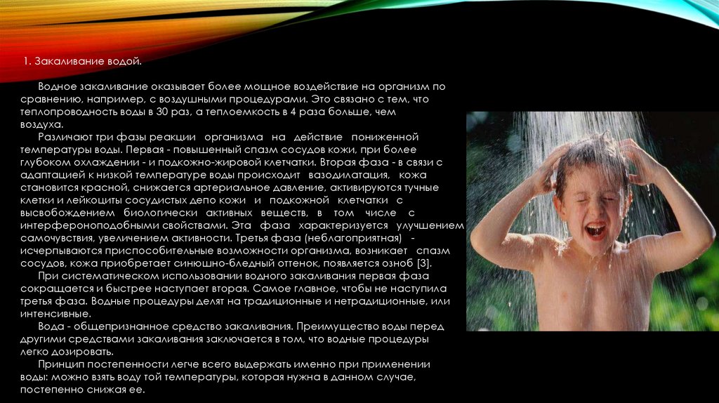 1. Закаливание водой.Водное закаливание оказывает более мощное воздействие на организм по