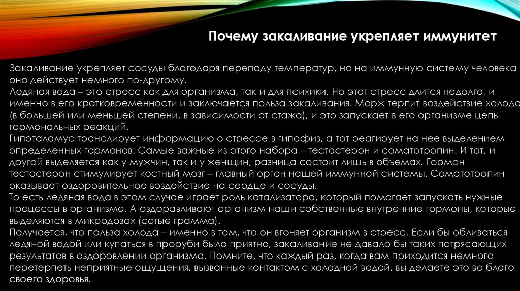 ледяной водой или купаться в проруби было приятно, закаливание не давало бы таких потрясающих