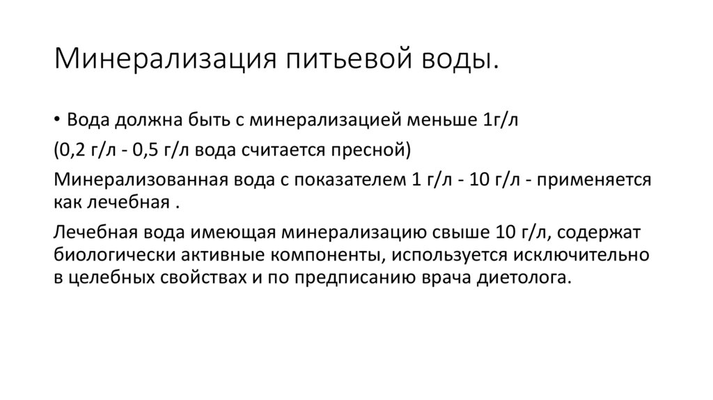 Минерализация питьевой воды.• Вода должна быть с минерализацией меньше 1г/л