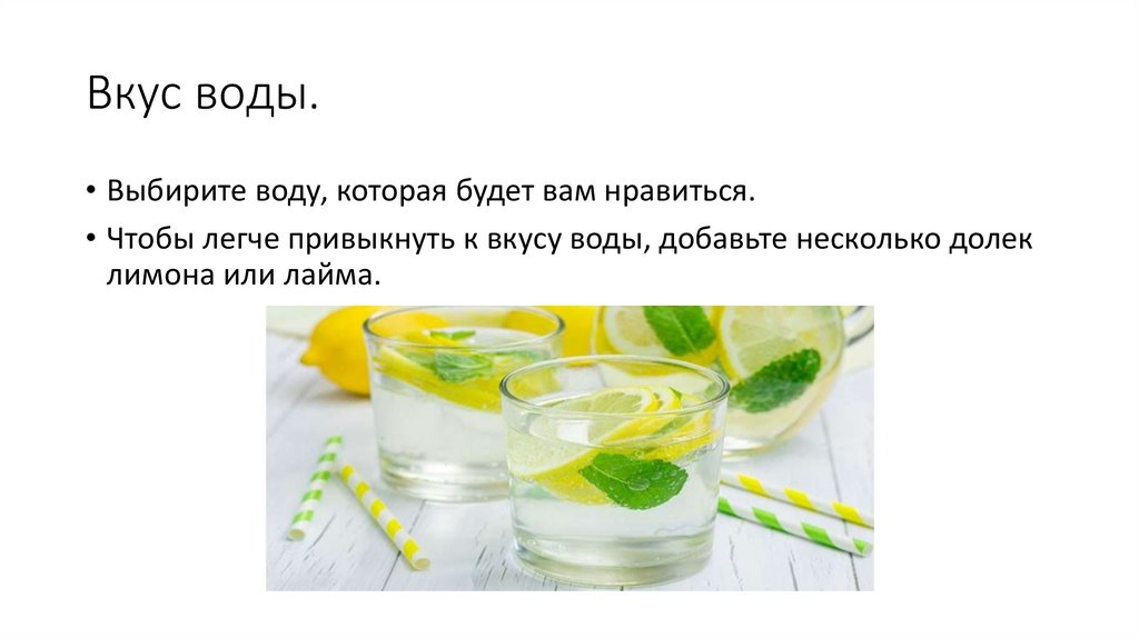 Вкус воды.• Выбирите воду, которая будет вам нравиться.