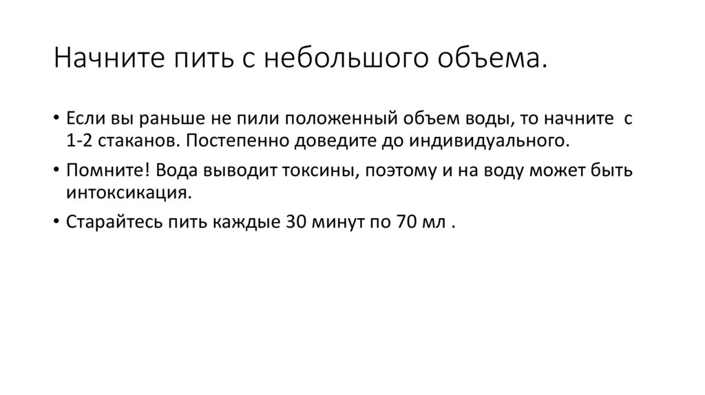 Начните пить с небольшого объема.• Если вы раньше не пили положенный объем воды, то начните с