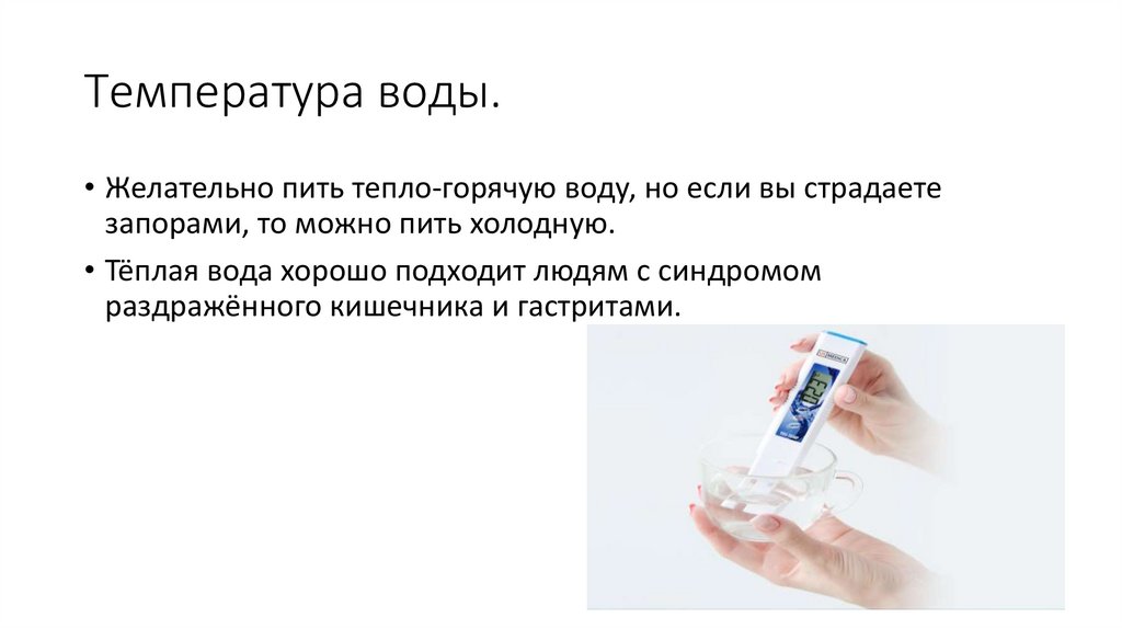 Температура воды.• Желательно пить тепло-горячую воду, но если вы страдаете