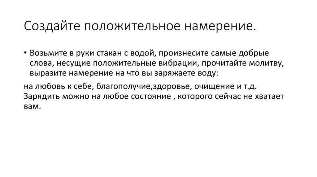 Создайте положительное намерение.• Возьмите в руки стакан с водой, произнесите самые добрые