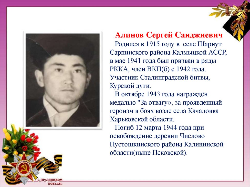 Алинов Сергей СанджиевичРодился в 1915 году в селе Шарнут