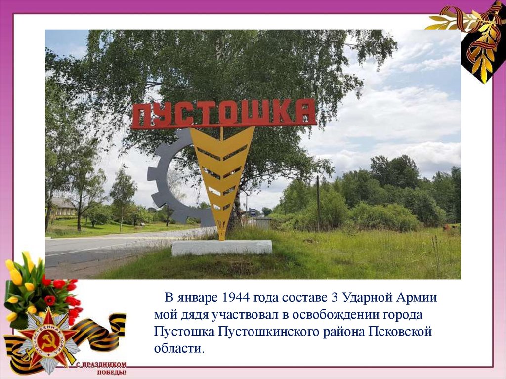 В январе 1944 года составе 3 Ударной Армиимой дядя участвовал в освобождении города