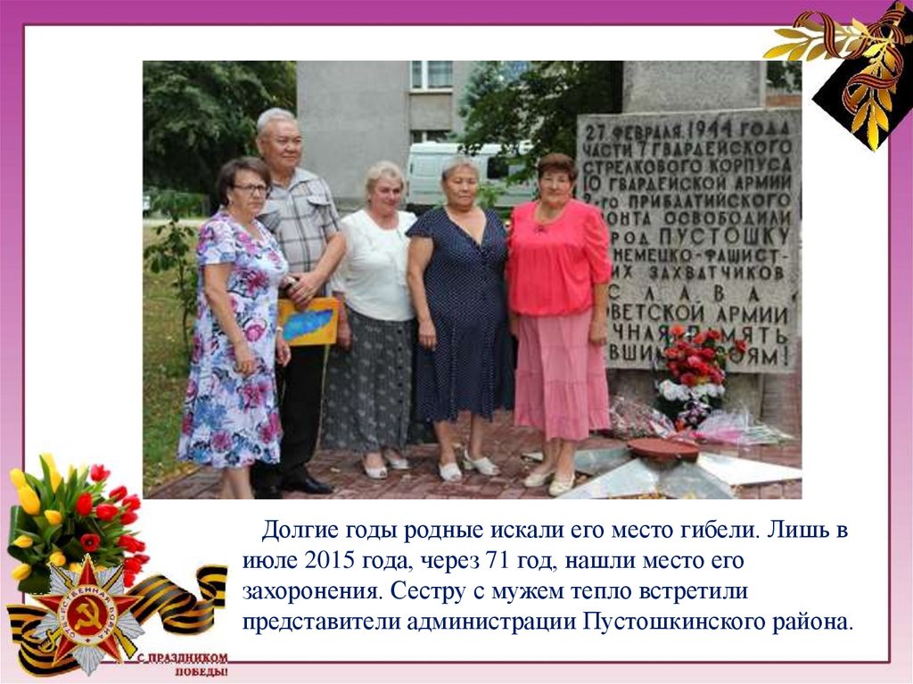 Долгие годы родные искали его место гибели. Лишь виюле 2015 года, через 71 год, нашли место его