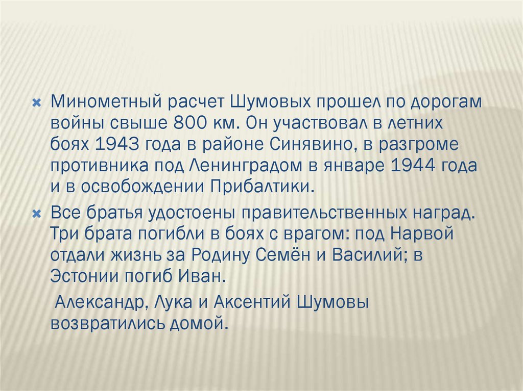 Минометный расчет Шумовых прошел по дорогамвойны свыше 800 км. Он участвовал в летних