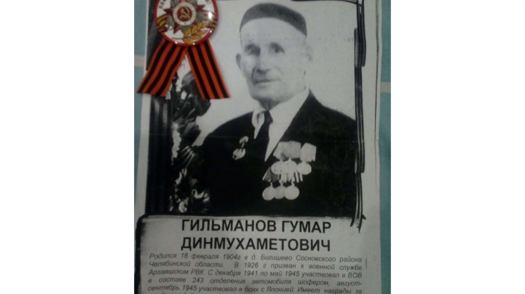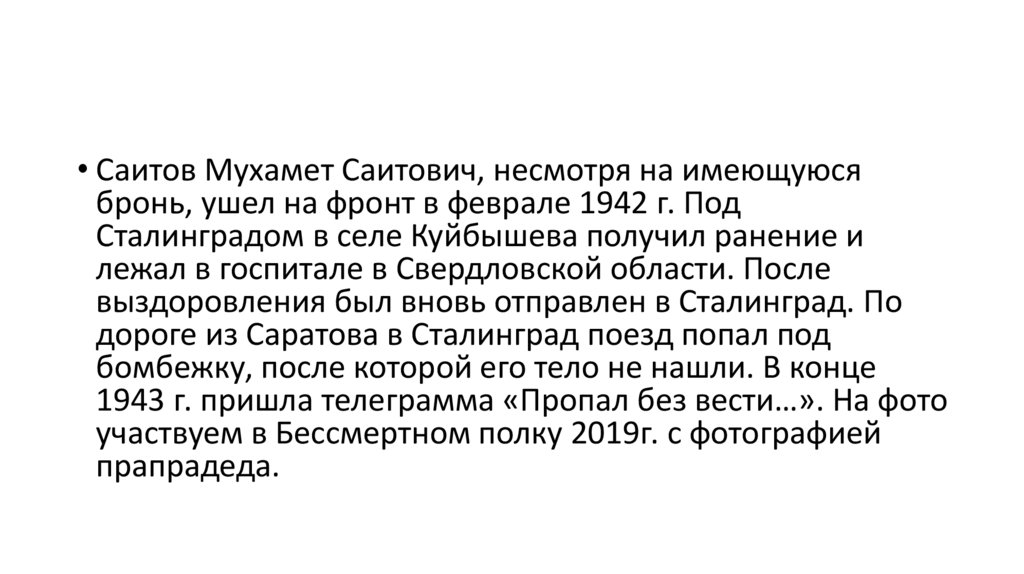 • Саитов Мухамет Саитович, несмотря на имеющуюсябронь, ушел на фронт в феврале 1942 г. Под