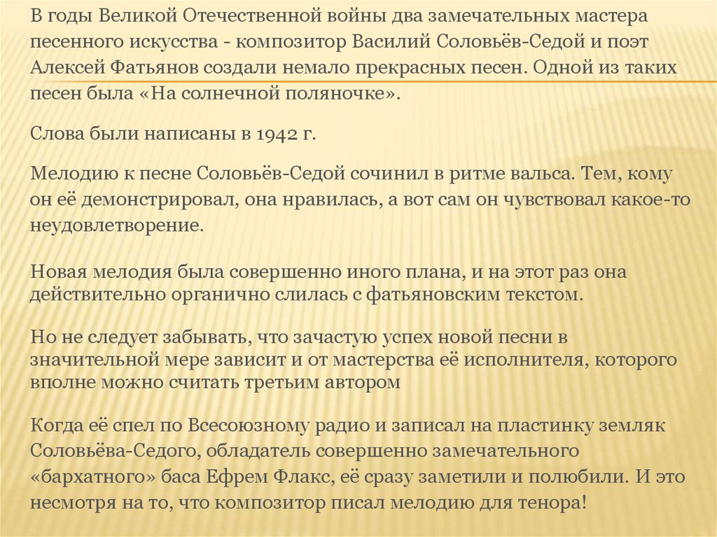 В годы Великой Отечественной войны два замечательных мастерапесенного искусства - композитор Василий Соловьёв-Седой и поэт