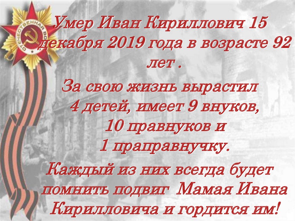 Умер Иван Кириллович 15декабря 2019 года в возрасте 92