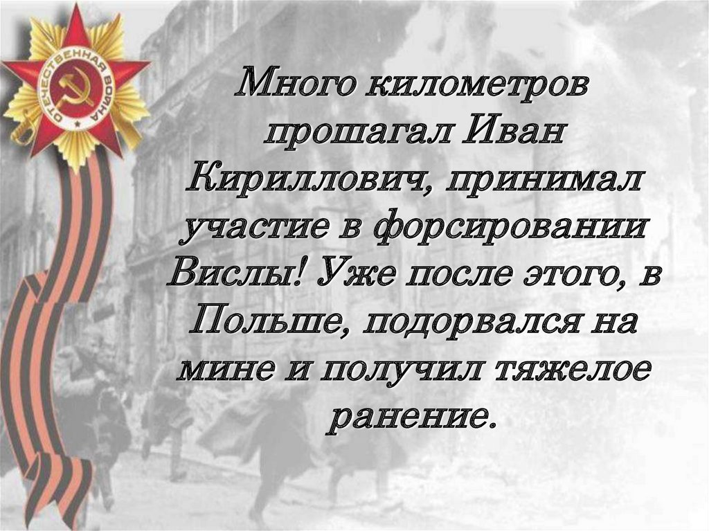 9. Довелось Ивану Кирилловичу воевать и во фронтовой разведке, так называемом СМЕРШе. Хорошо помнит, как шел пешком без оружия 12