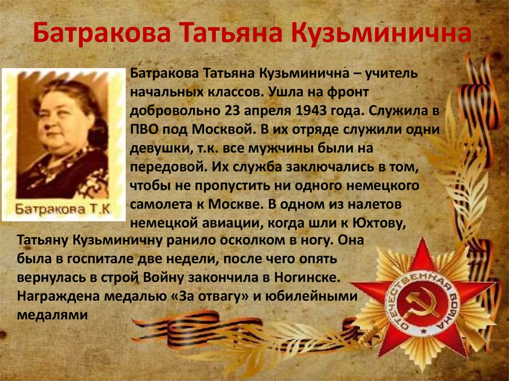 Батракова Татьяна КузьминичнаБатракова Татьяна Кузьминична – учитель