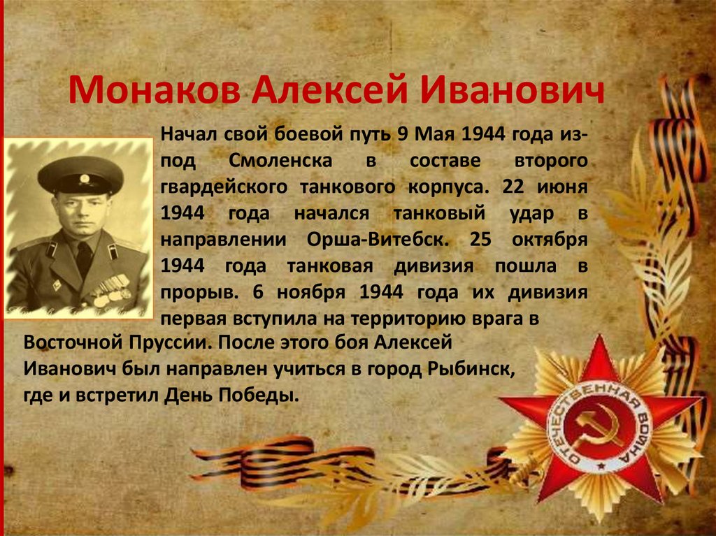Монаков Алексей ИвановичНачал свой боевой путь 9 Мая 1944 года изпод Смоленска в