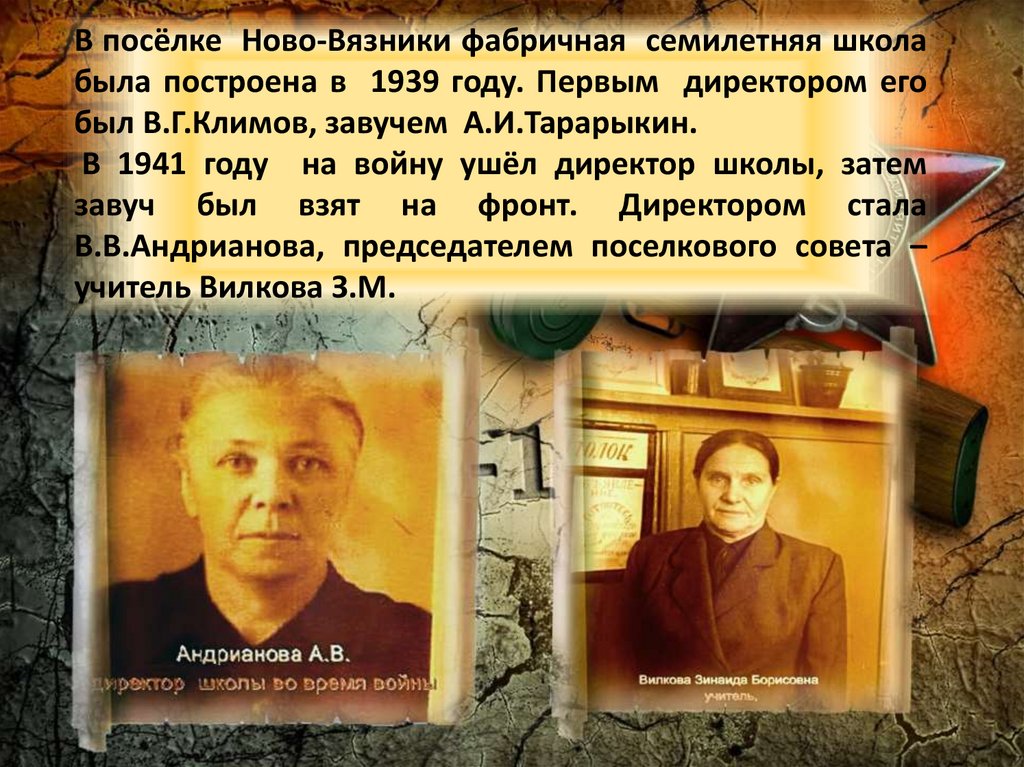 В посёлке Ново-Вязники фабричная семилетняя школабыла построена в 1939 году. Первым директором его