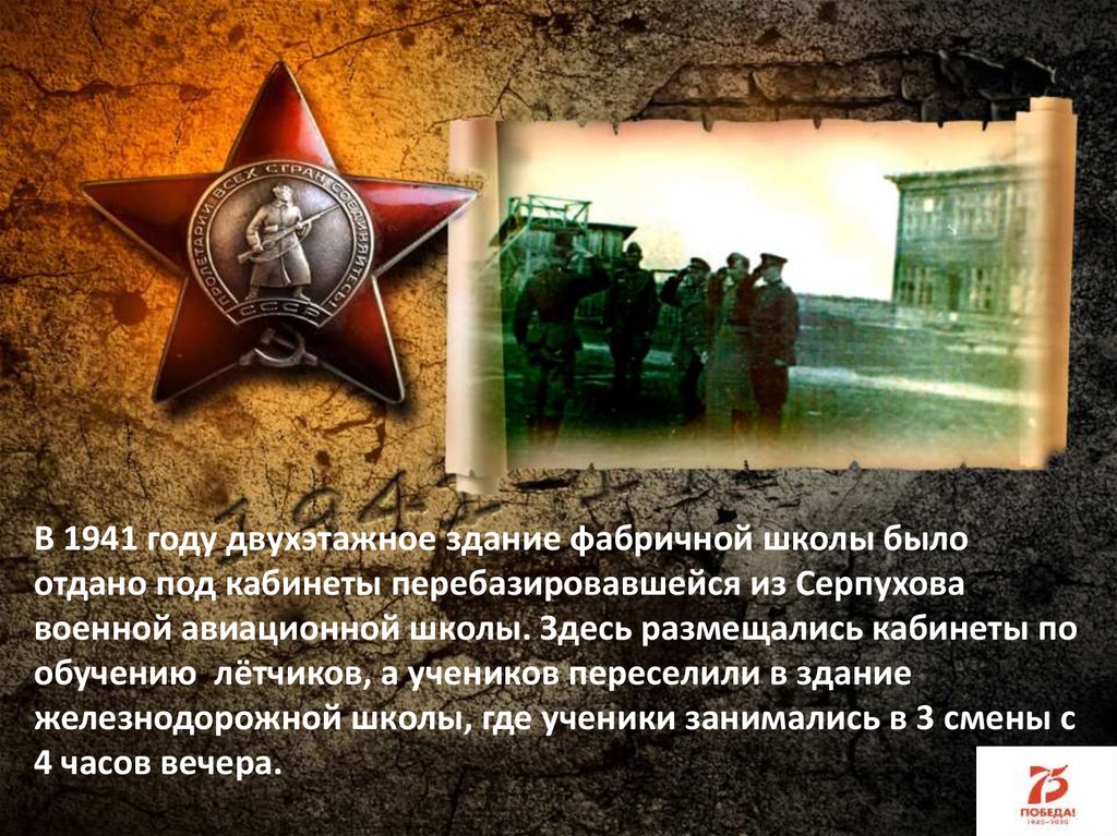В 1941 году двухэтажное здание фабричной школы былоотдано под кабинеты перебазировавшейся из Серпухова