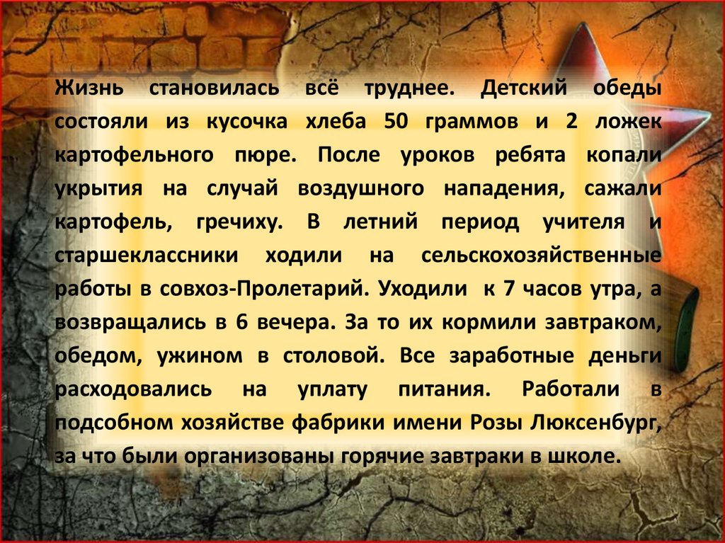 Жизнь становилась всё труднее. Детский обедысостояли из кусочка хлеба 50 граммов и 2 ложек