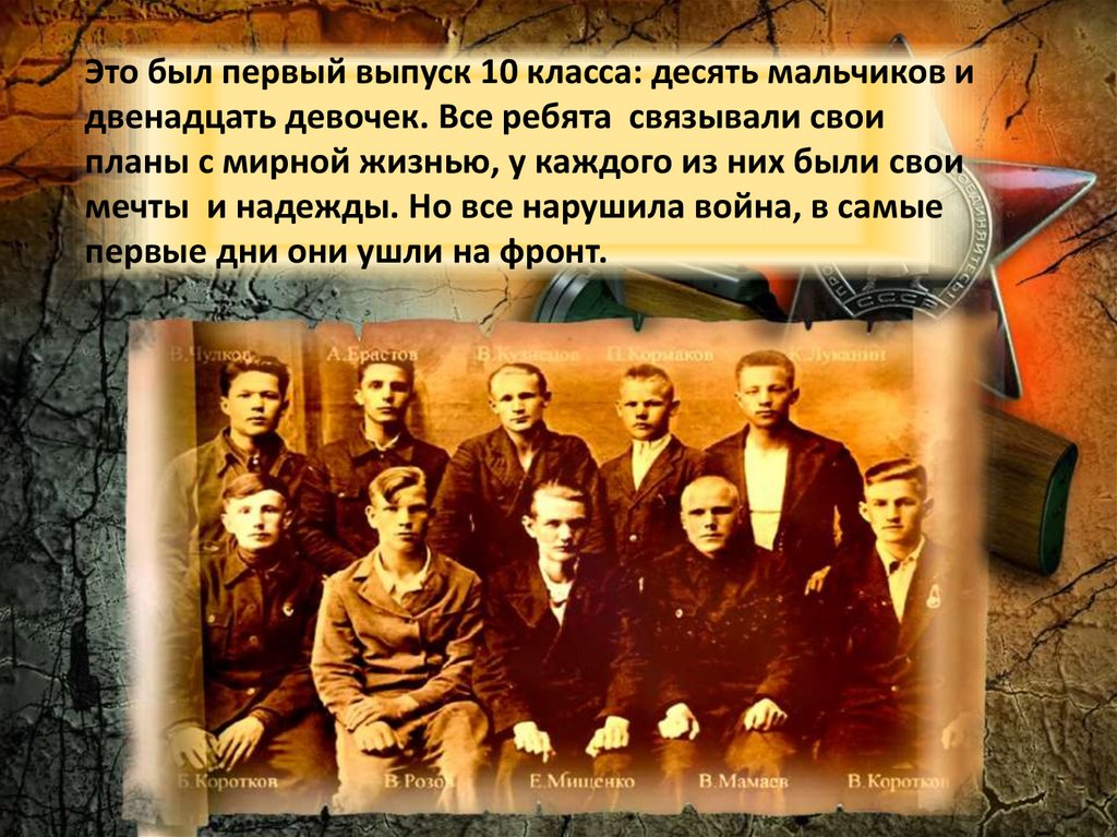 Это был первый выпуск 10 класса: десять мальчиков идвенадцать девочек. Все ребята связывали свои