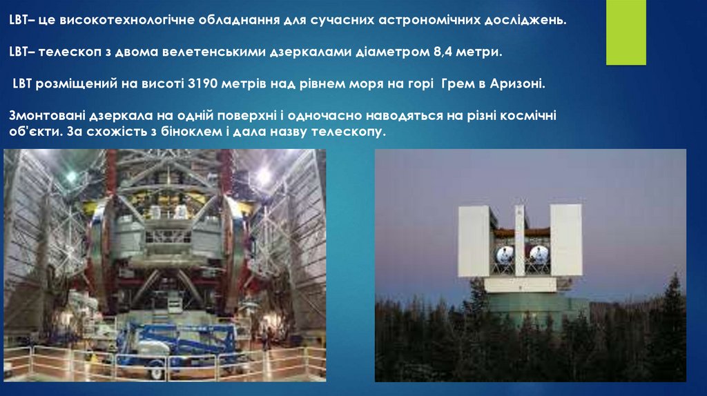 LBT– це високотехнологічне обладнання для сучасних астрономічних досліджень.LBT– телескоп з двома велетенськими дзеркалами діаметром 8,4 метри.