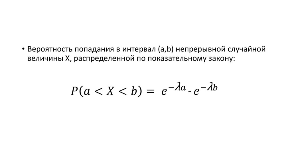 • Вероятность попадания в интервал (a,b) непрерывной случайнойвеличины X, распределенной по показательному закону: