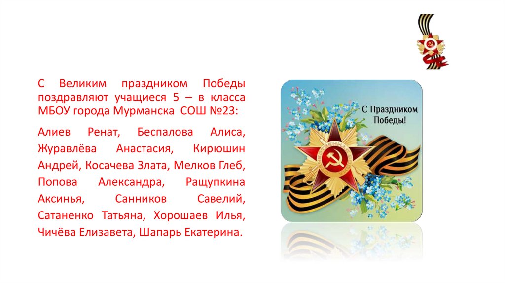 С Великим праздником Победыпоздравляют учащиеся 5 – в класса