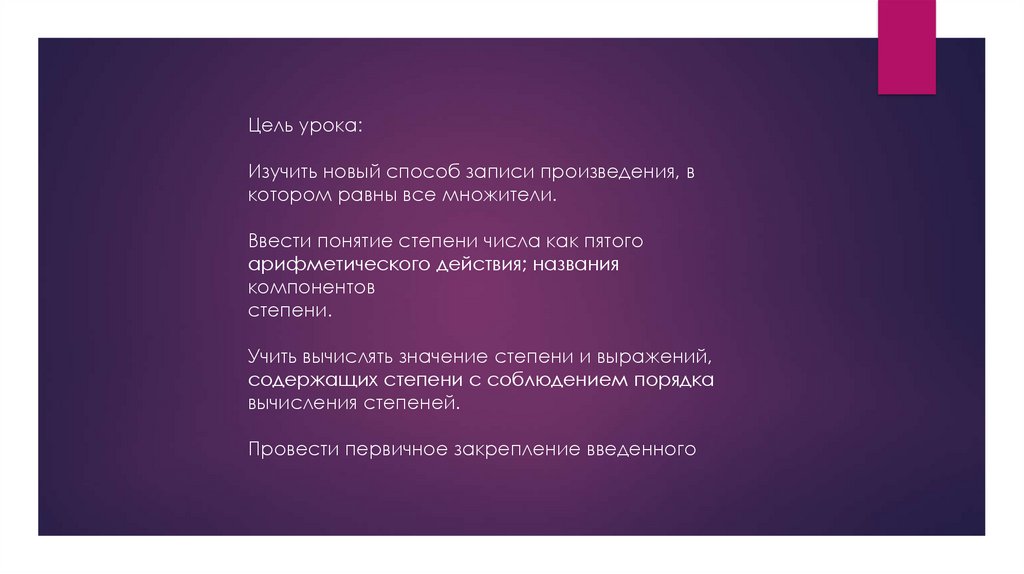 Ввести понятие степени числа как пятого