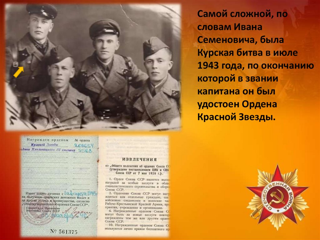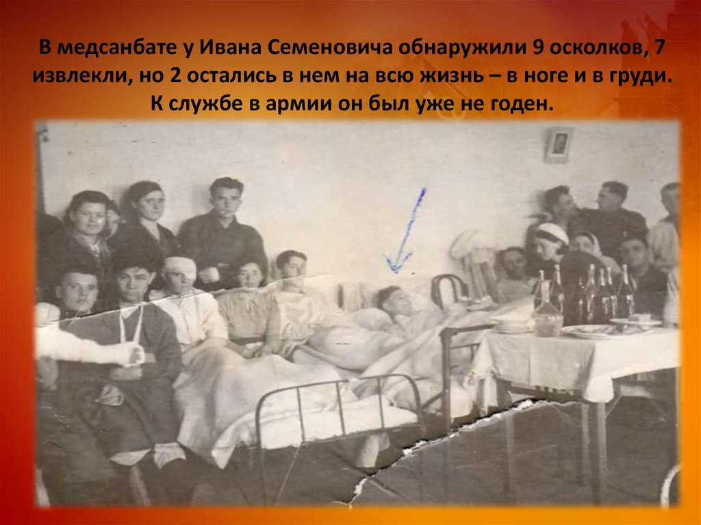 В медсанбате у Ивана Семеновича обнаружили 9 осколков, 7извлекли, но 2 остались в нем на всю жизнь – в ноге и в груди.