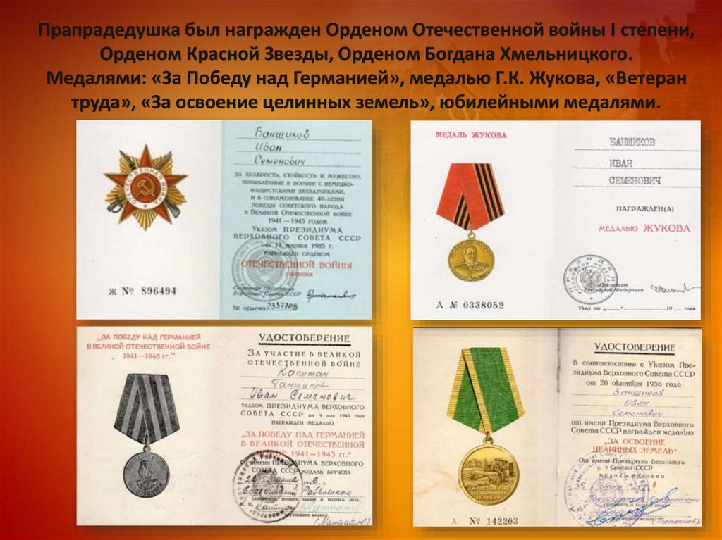Прапрадедушка был награжден Орденом Отечественной войны I степени,Орденом Красной Звезды, Орденом Богдана Хмельницкого.