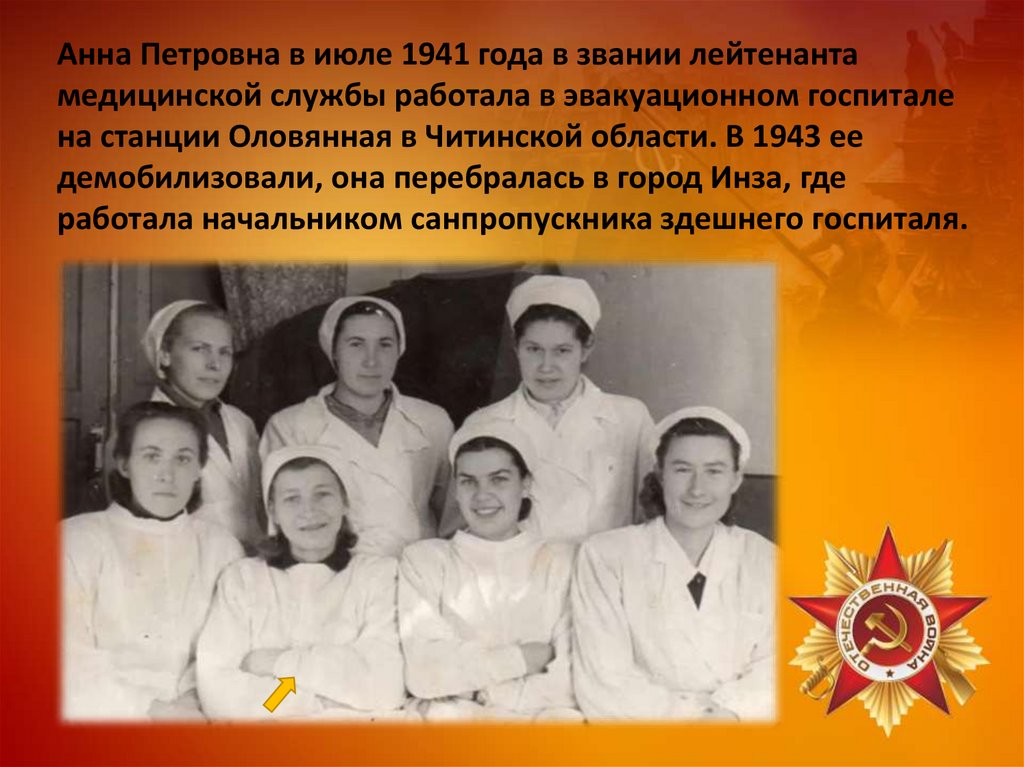 Анна Петровна в июле 1941 года в звании лейтенантамедицинской службы работала в эвакуационном госпитале
