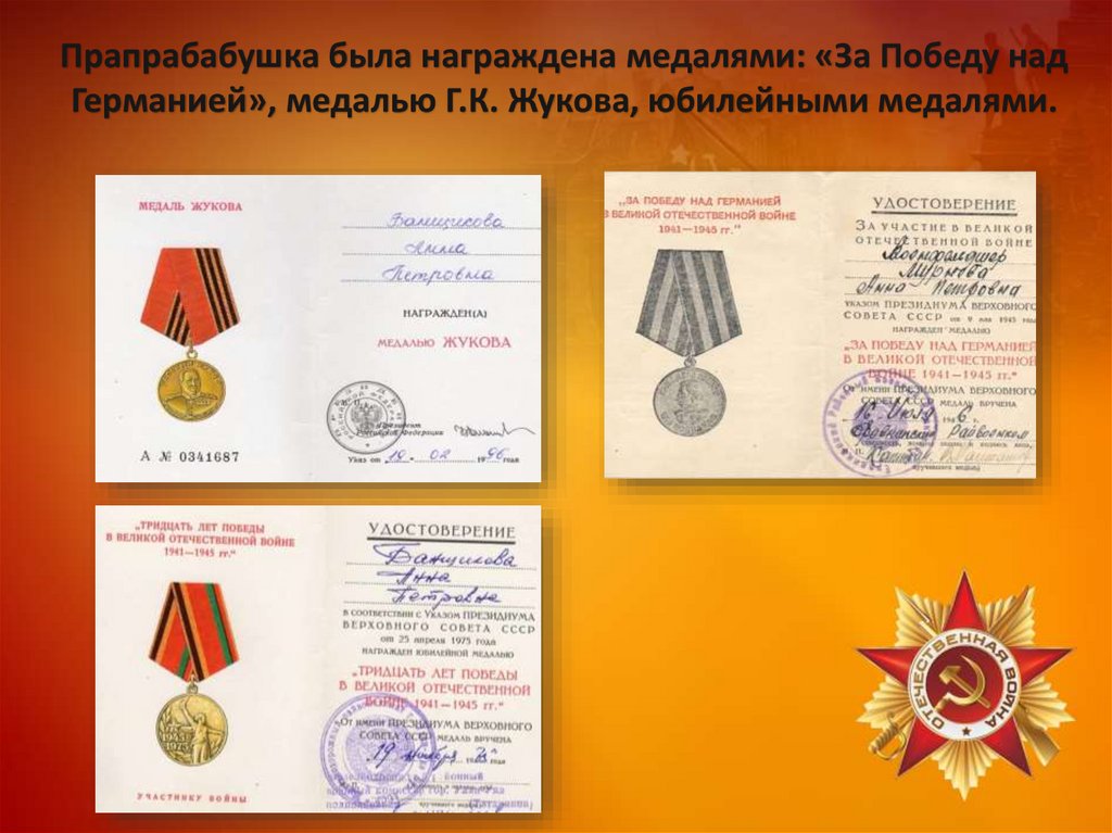 Прапрабабушка была награждена медалями: «За Победу надГерманией», медалью Г.К. Жукова, юбилейными медалями.
