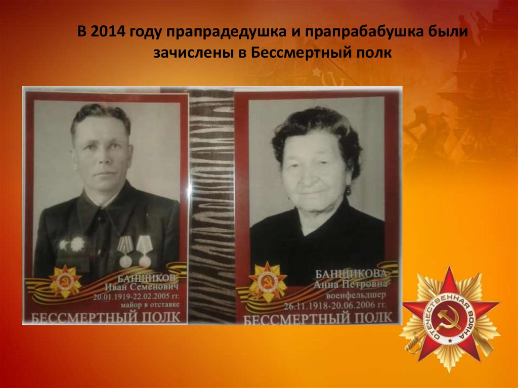 В 2014 году прапрадедушка и прапрабабушка былизачислены в Бессмертный полк