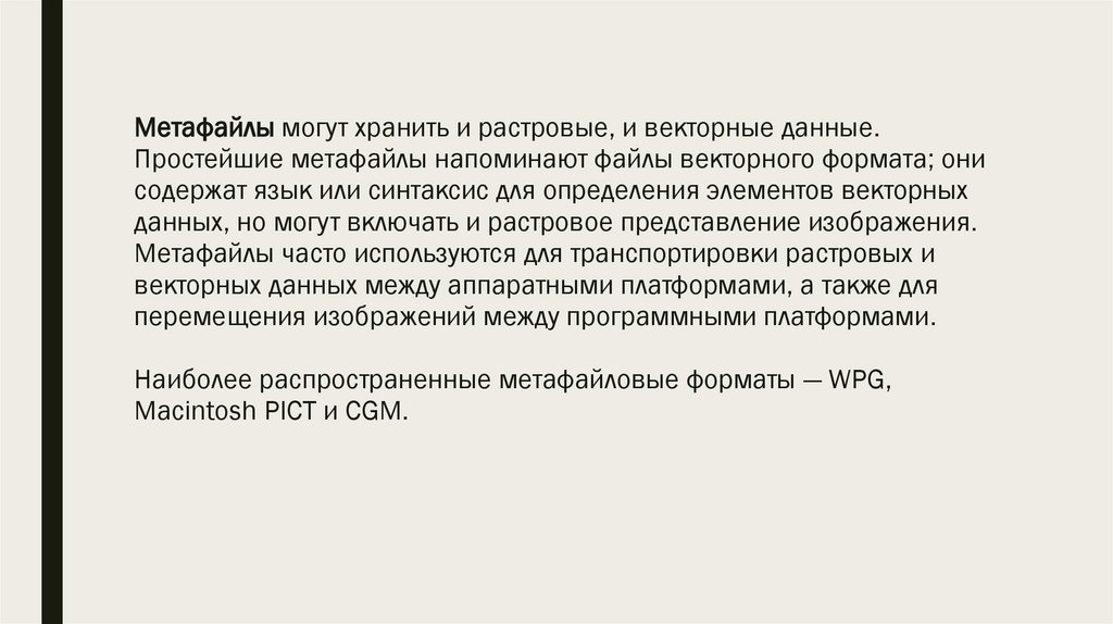 Метафайлы могут хранить и растровые, и векторные данные.Простейшие метафайлы напоминают файлы векторного формата; они