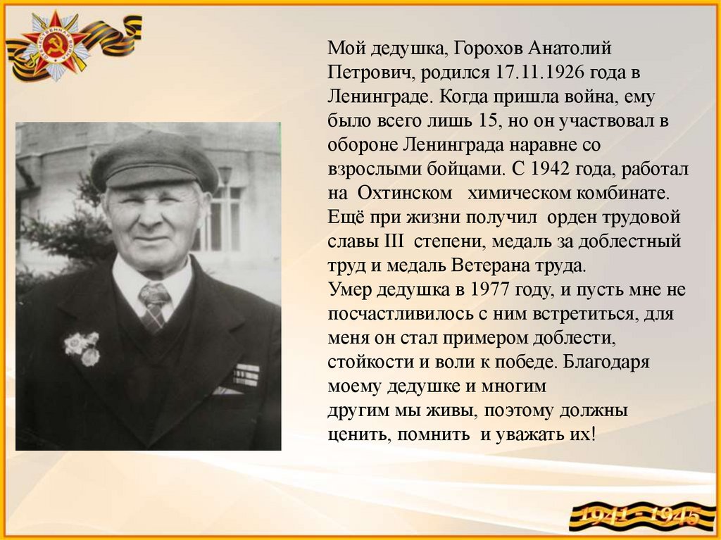 Мой дедушка, Горохов АнатолийПетрович, родился 17.11.1926 года в