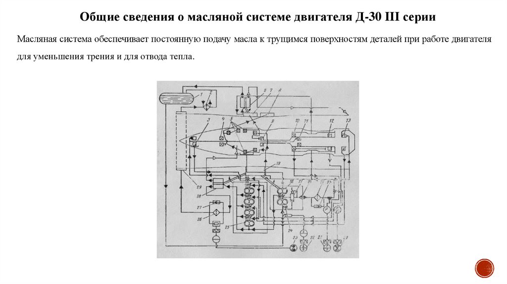 Общие сведения о масляной системе двигателя Д-30 III серииМасляная система обеспечивает постоянную подачу масла к трущимся поверхностям деталей при работе двигателя