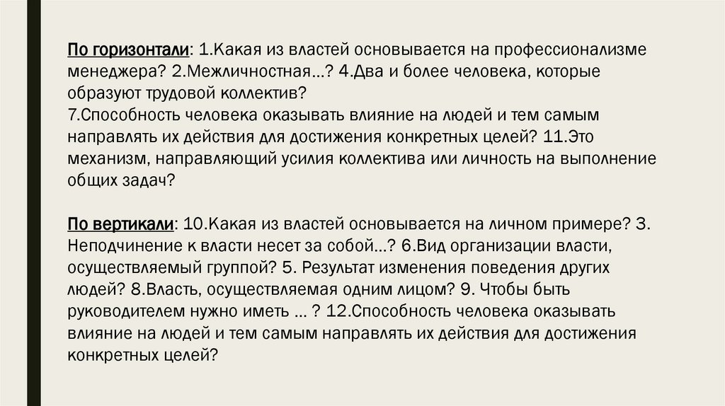 По горизонтали: 1.Какая из властей основывается на профессионализмеменеджера? 2.Межличностная…? 4.Два и более человека, которые