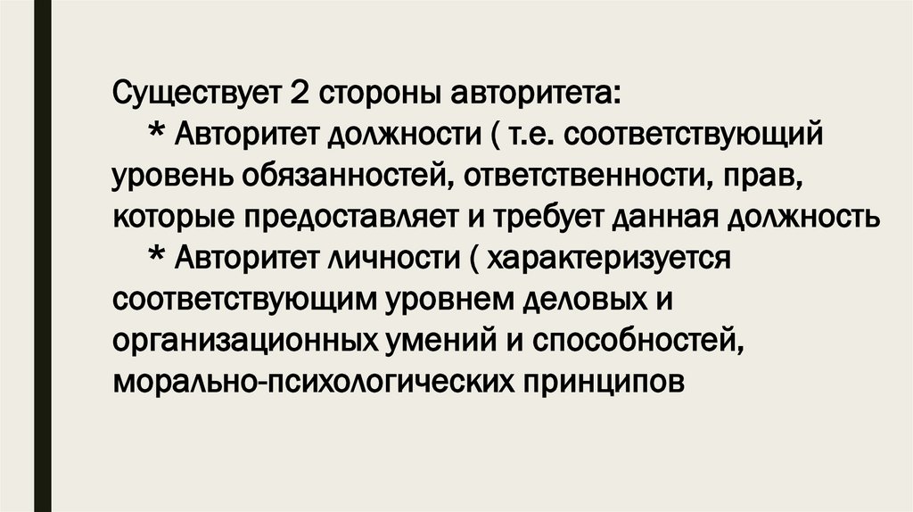 Существует 2 стороны авторитета:* Авторитет должности ( т.е. соответствующий