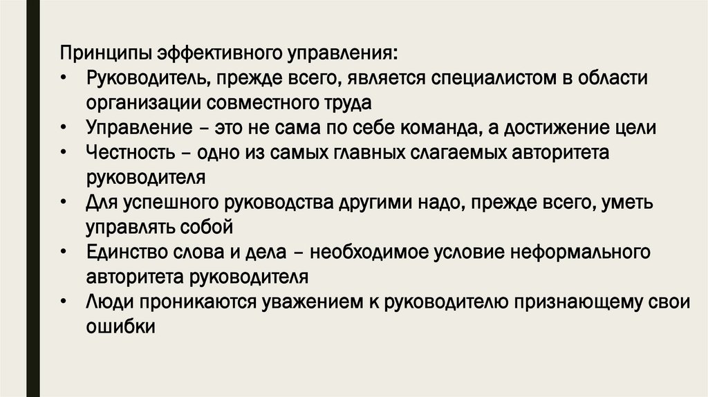 Принципы эффективного управления:• Руководитель, прежде всего, является специалистом в области