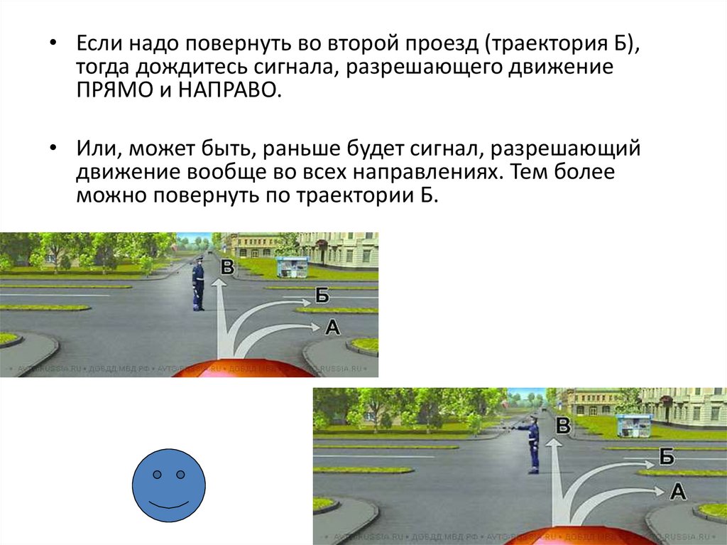 • Если надо повернуть во второй проезд (траектория Б),тогда дождитесь сигнала, разрешающего движение
