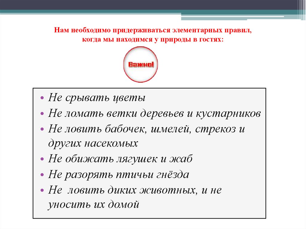 Нам необходимо придерживаться элементарных правил,когда мы находимся у природы в гостях: