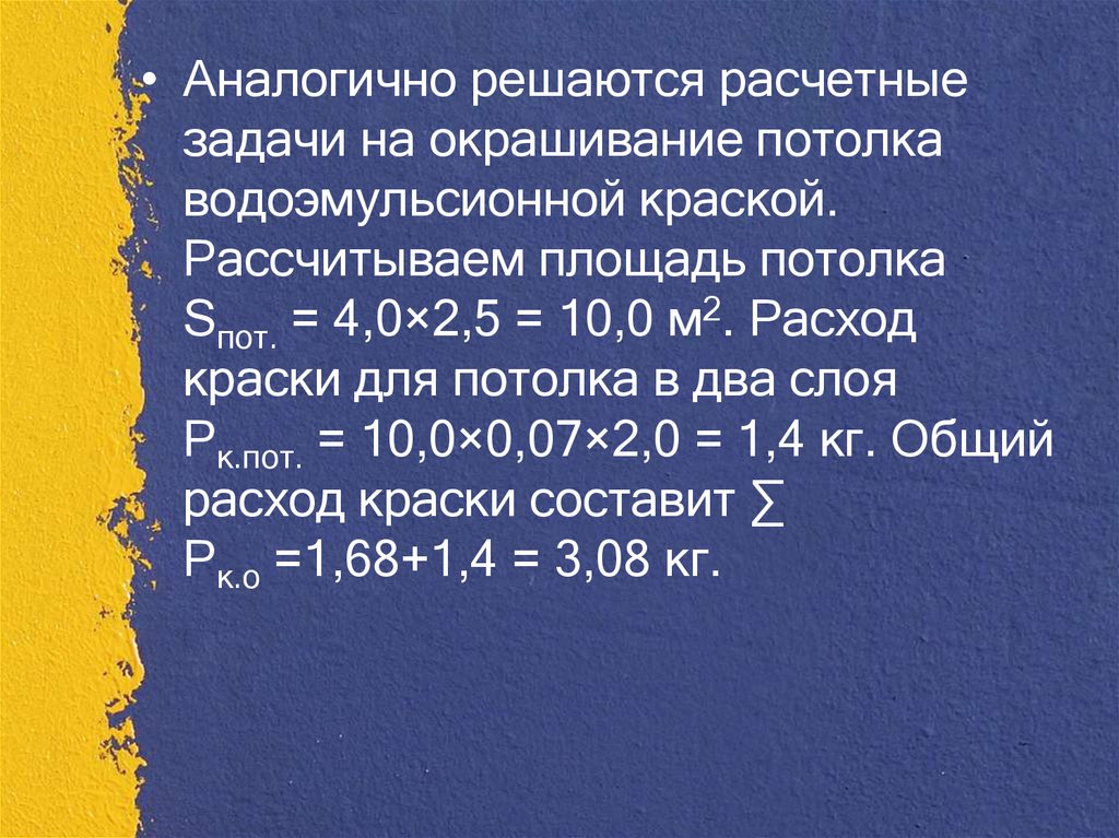 • Аналогично решаются расчетныезадачи на окрашивание потолка