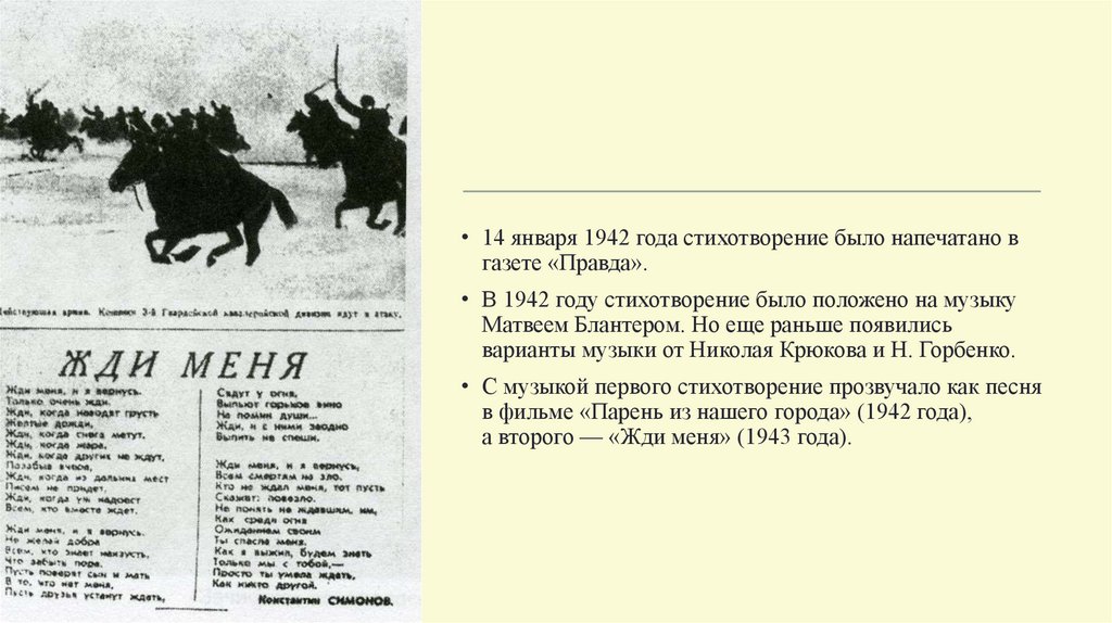 • 14 января 1942 года стихотворение было напечатано вгазете «Правда».