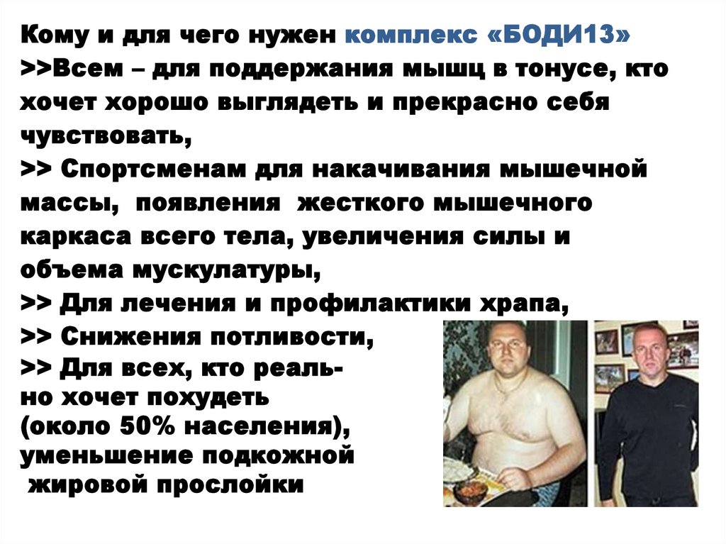 Кому и для чего нужен комплекс «БОДИ13»>>Всем – для поддержания мышц в тонусе, кто