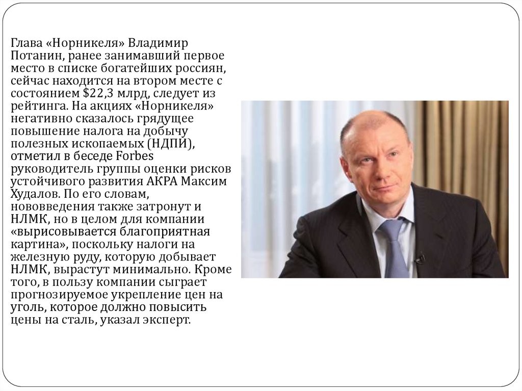 Глава «Норникеля» ВладимирПотанин, ранее занимавший первое