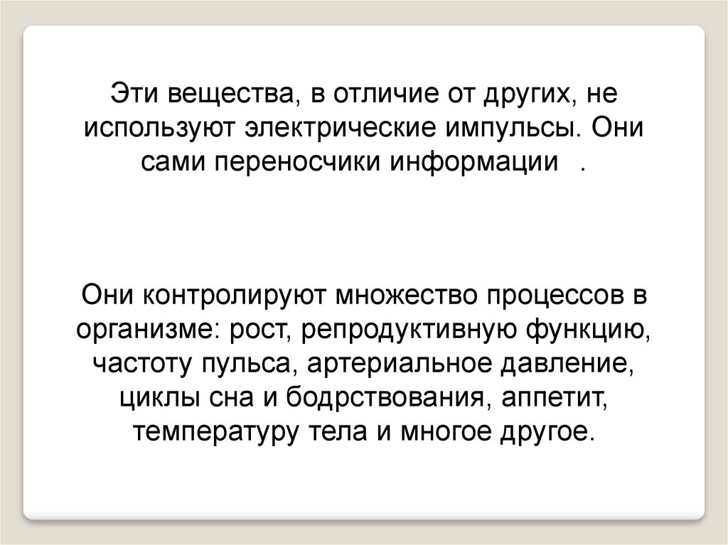 Эти вещества, в отличие от других, неиспользуют электрические импульсы. Они