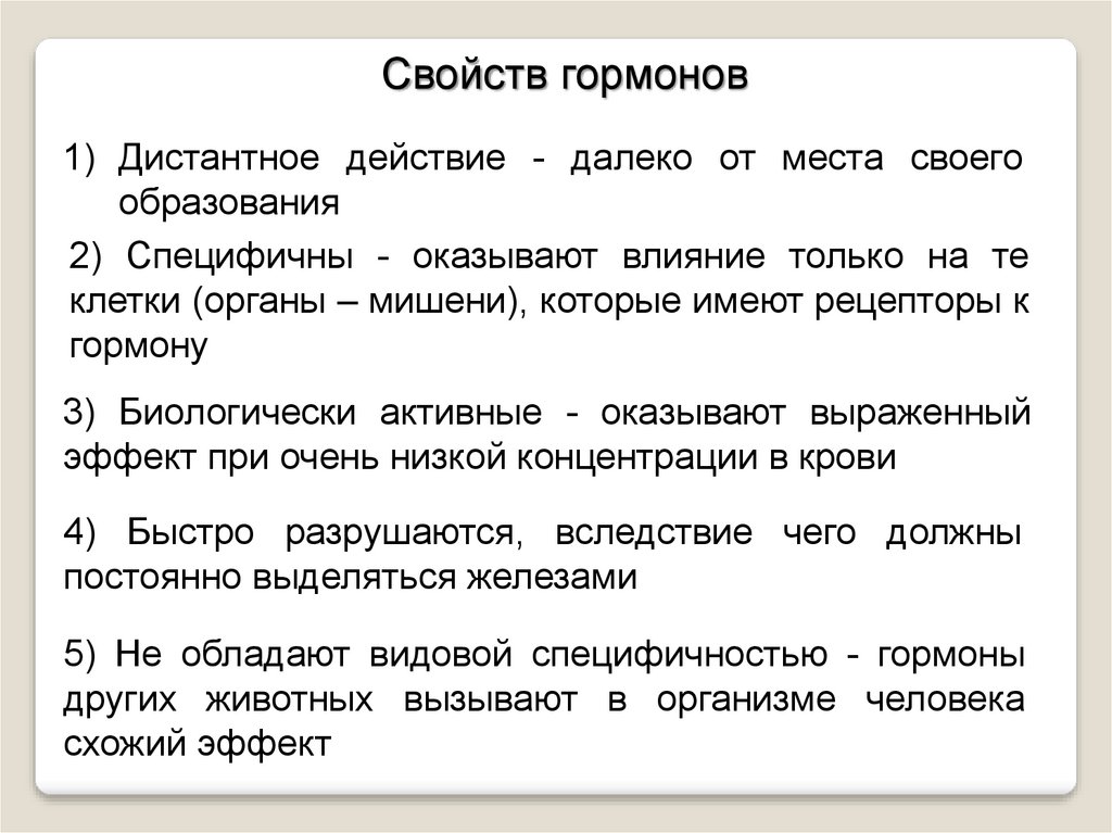 Свойств гормонов1) Дистантное действие - далеко от места своего