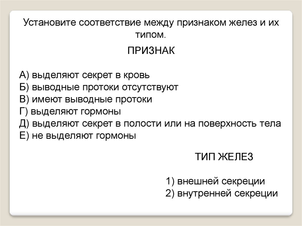 Установите соответствие между признаком желез и ихтипом.